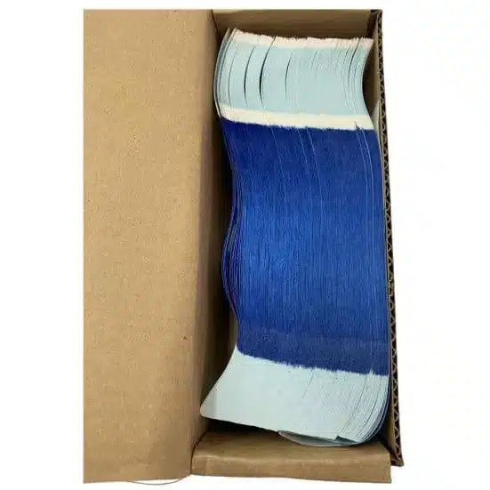 NF String & Son has developed a revolutionary new method of applying latex adhesive. In general, glued sheets do not need to be pulled apart. Due to their greater versatility, more and more banks are switching to currency straps. The 1 1/4″ blue currency straps are available in solid bar edges.