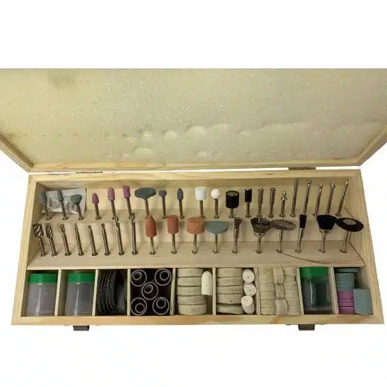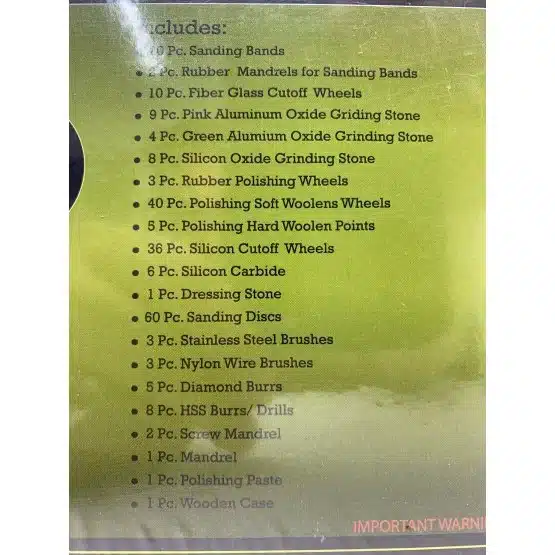 - Extensive Variety: Includes a large assortment of mounted grinding stones, diamond and carbide burrs, metal and bristle brushes, sanding drums (both large and small), wool polishing wheels, felt bobs, and dozens of cut-off, sanding, and abrasive wheels.