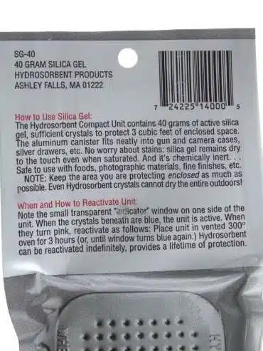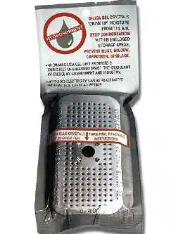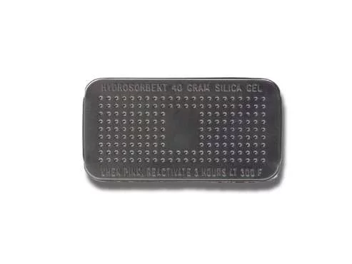 40 Gram Silica Gel Desiccant by Hydrosorbent. Protect against environmental elements like mold, mildew, rust, and corrosion. The unit has a built in gauge that changes color and alarms the need for revival. You can reactivate it in a kitchen oven without refills. Buy once, use forever.