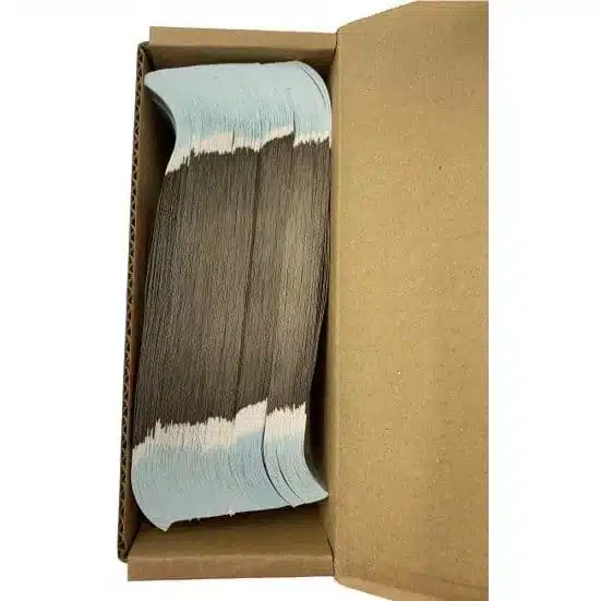 NF String & Son has developed a revolutionary new method of applying latex adhesive, so no glued sheets need to be pulled apart. Due to their greater versatility, more and more banks are switching to currency straps. The 1 1/4″ currency straps are available in solid bar edges. They have a large glue overlap area for easy size adjustment.