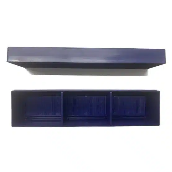 Single Row Blue 9x2x2 plastic coin storage box for holding 2×2 mylar coin flips, with two dividers, durable and strong with high quality. Holds 39 2X2 Plastic Holders. Use for storage and organization of your precious collectibles.