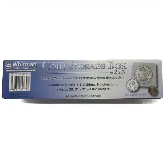 Single Row Blue 9x2x2 plastic whitman coin storage box for holding 2×2 mylar coin flips, with two dividers, durable and strong with high quality. Holds 39 2X2 Plastic Holders. Use for storage and organization of your precious collectibles.