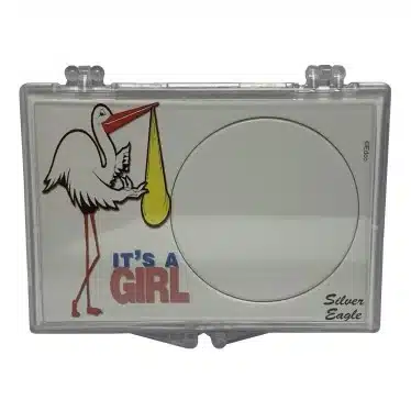 Showcase your American Silver Eagle in style with our premium It’s a Girl Stork snap lock coin holder. This exceptional display holder is ideal for presenting a child’s very first collection of valuable coins. Don’t miss out on the opportunity to order yours today, as supplies are limited!