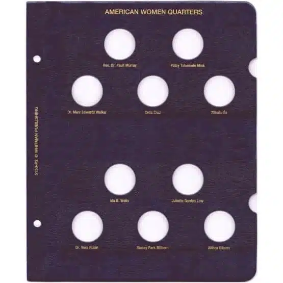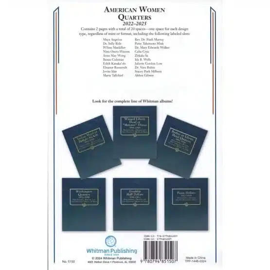 The American Woman Album Cover features a design with 20 openings spread over two pages, complete with slides. Also, showcases the stories and achievements of influential women who have shaped history, culture, and society. This tribute serves women’s empowerment across various fields. Order your Whitman coin album today!
