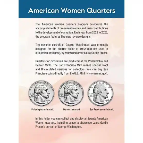 Introducing the American Women Quarters Book, a colorful limited edition mint folder for the years 2022-2025. This beautifully designed folder showcases the iconic American Women Quarters, highlighting the achievements and contributions of remarkable women in American history. Get your hands on this exclusive collector’s item today!