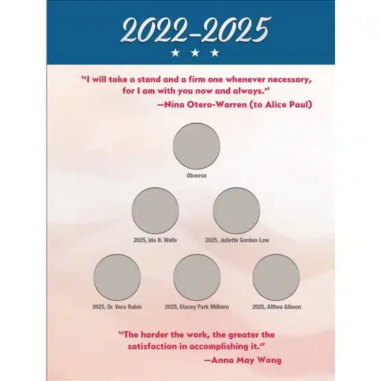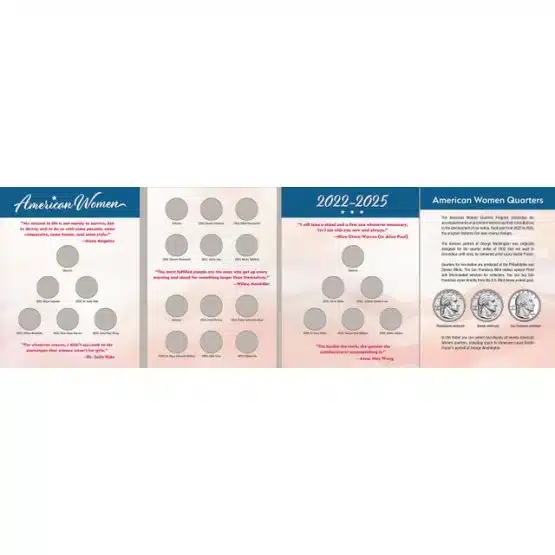 The American Women quarters book is a remarkable coin folder for coins minted from 2022 to 2025. Each showcases an opening dedicated to the influential women who have shaped American history. This collectible coin series serves as a testament to women’s contributions, and the colorful coin folder beautifies any numismatic collection.