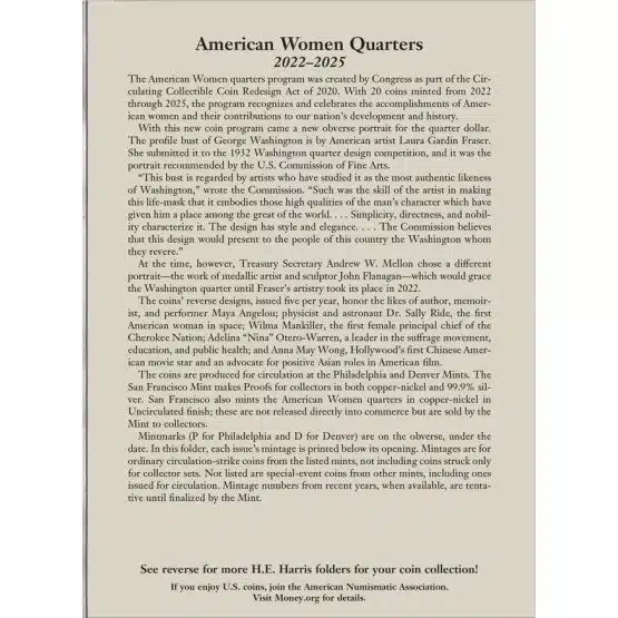 In summary, the American Women Quarters collection book folder not only represents a celebration of remarkable women in history but also serves as a valuable addition to any coin collection, housed neatly within the Harris Brand Folder.