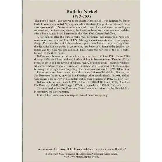 - Educational Resource: Each folder contains historical background, mintage data, and series details, offering valuable insights into the Buffalo nickel series.