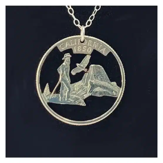 Specifically, the necklace features a beautifully cut coin from the first quarter released in 2005. Generally, honoring California as the 31st state in the United States Mint’s 50 State Quarters Program. Further, admitted into the Union on September 9, 1850, California is affectionately known as the “Golden State.”