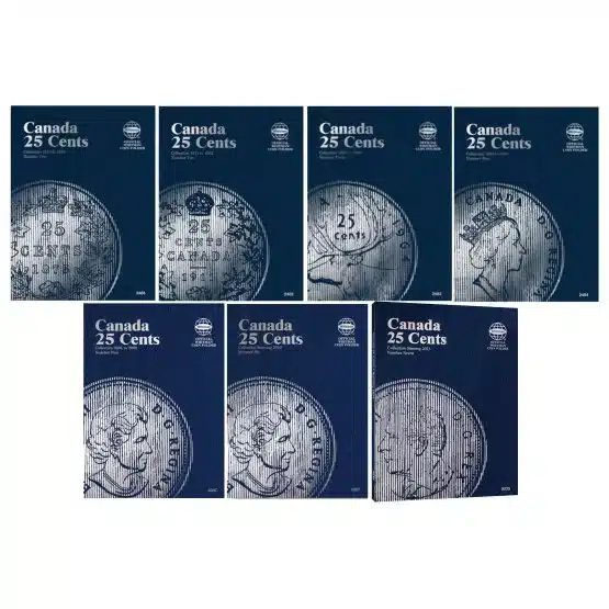Further, each Whitman coin folder highlights unique milestones in Canada’s evolution. They generally feature coins that reflect significant moments from the early days of Confederation to contemporary times. Above all, here’s a few of the available Canada 25 cent coin folders, (sold separately):