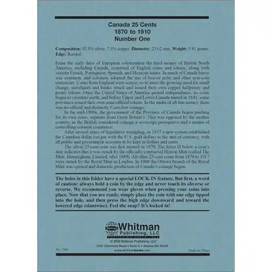 In conclusion, the Whitman Canada 25 cent coin folders provide a practical solution for organizing and displaying your coins. It also enriches collectors’ experiences with their thoughtful design and historical insights. Further, these folders are an essential addition to any coin collection. They will generally ensure that both novice and experienced collectors can appreciate the beauty and significance of Canada’s numismatic heritage.