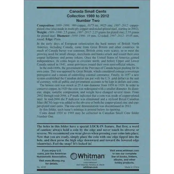 In conclusion, the Whitman Canadian penny coin folder (1989-2012) for Collectors is an essential tool for novice and seasoned collectors. Its thoughtful design not only ensures easy organization and protection of your coins but also enriches your collecting journey with historical insights. Additionally, with its durable construction and user-friendly features, this coin folder is the perfect way to showcase and preserve your collection for years to come.