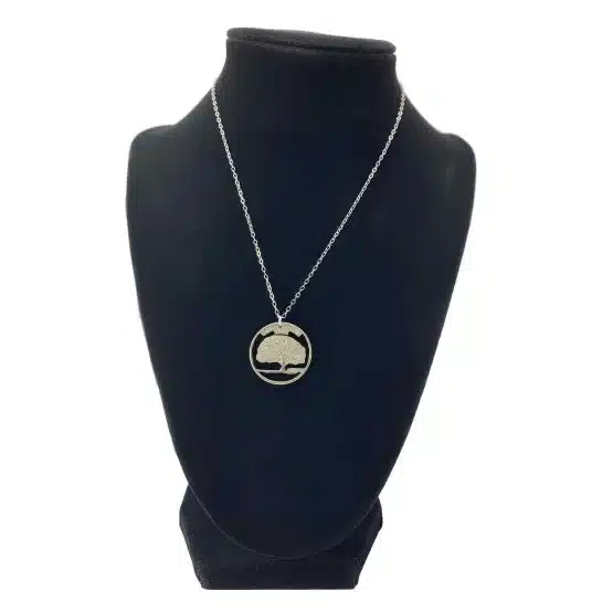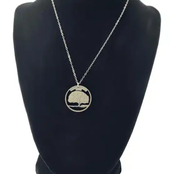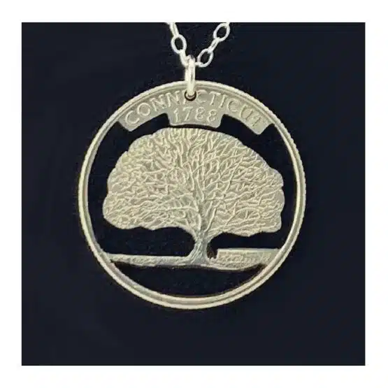 Crafted from the last commemorative quarter minted in 1999, which represents Connecticut, the fifth state to join the union, this necklace encapsulates the essence of the Constitution State. Lastly, consider the design featuring the depiction of Samuel Wylly’s oak tree, known as “The Charter Oak,” symbolizing strength and resilience.