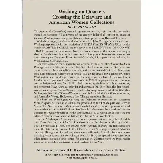 This Crossing the Delaware quarter collection folder includes openings for the Philadelphia and Denver Mints, featuring the designs from 2021 to 2025. Keep your American Women quarters organized and display them proudly in this high-quality coin folder by HE Harris.