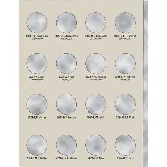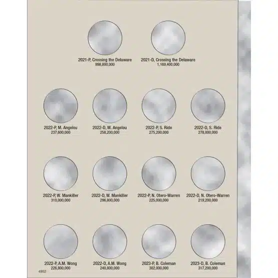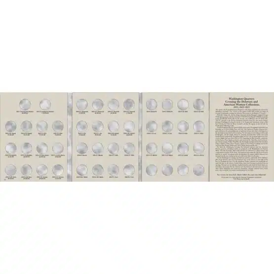 - Designed for Washington Quarters, specifically the 2021-2025 Crossing the Delaware and American Women series. Holds coins from both Philadelphia and Denver mints