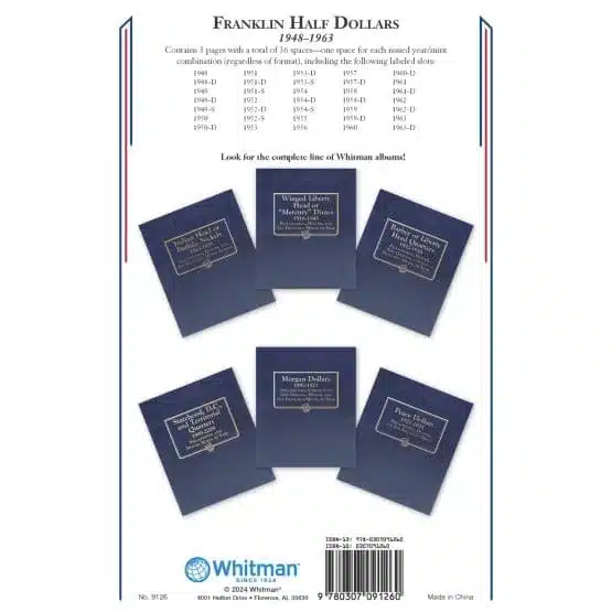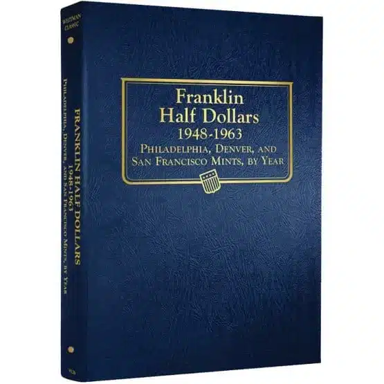 The 1948-1963 Franklin Half Dollar Album is, indeed, a vital investment for serious collectors. Moreover, this Whitman coin album design securely stores and displays Franklin Half Dollars in an elegant manner. Furthermore, the album offers durable construction and a thoughtful layout. It includes snug slots to prevent coin movement and damage. Additionally, its clear protective cover enhances visibility, allowing coins to shine.