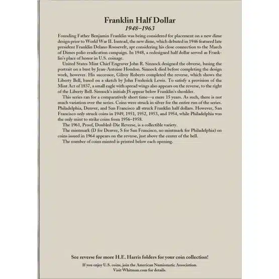 In conclusion, discover where collecting begins with the HE Harris Franklin Half Dollar Collection (1948 to 1963) coin folder. Uncover a reliable and efficient method for storing, protecting, and basically displaying your treasured Franklin coin collection.