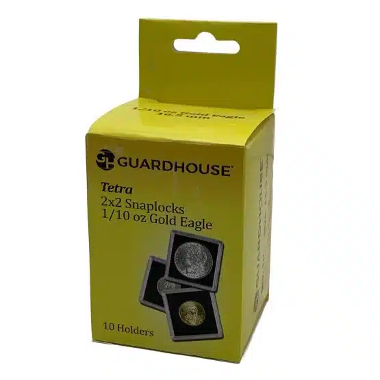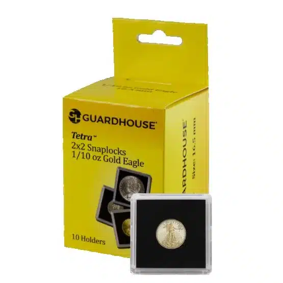 Introducing the Tetra Guardhouse 2×2 snaplock, premium gold coin holders designed specifically for the 1/10-ounce American Gold Eagle. Moreover, each box contains 10 individual cases that offer superior protection and presentation for valuable coins. Their crafted of durable acrylic plastic and also feature a sleek black foam interior that complements the elegance of the coin.