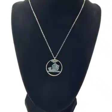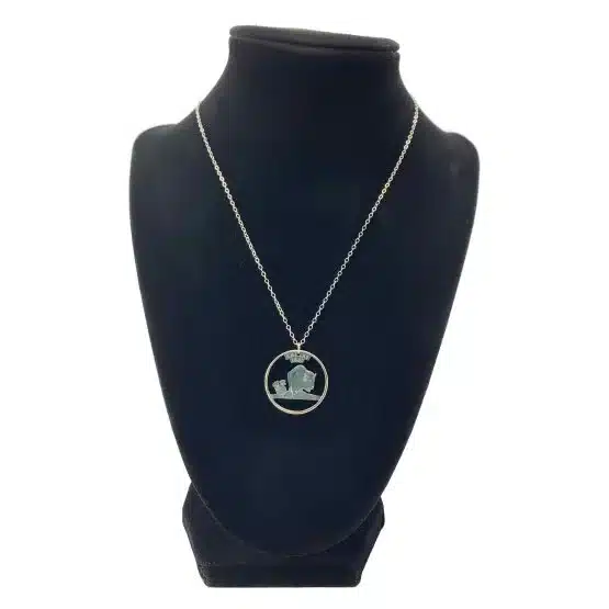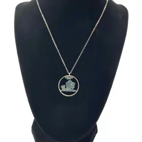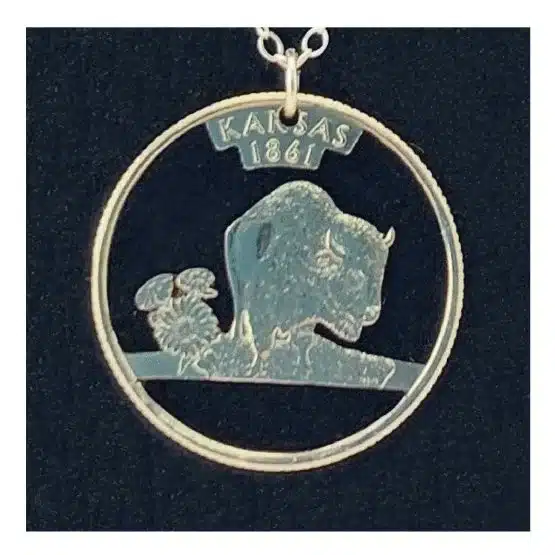 Additionally, the Kansas State Necklace features a beautifully crafted pendant cut from the commemorative quarter that honors the “Sunflower State.” Specifically, this quarter, released in Q4 2005, celebrates Kansas becoming the 34th state on January 29, 1861. Furthermore, the design features two Kansas symbols: the majestic buffalo and the vibrant sunflower, representing the state’s history and beauty.