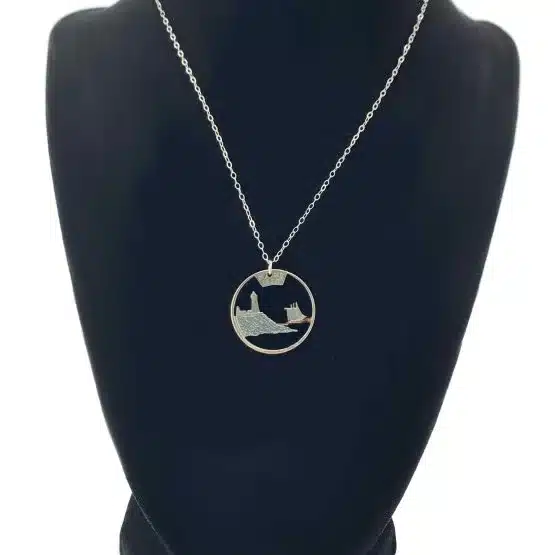- Intricate Cut-Out Design: The necklace beautifully showcases the Pemaquid Point Light atop a granite coast, retaining the original details of the quarter.