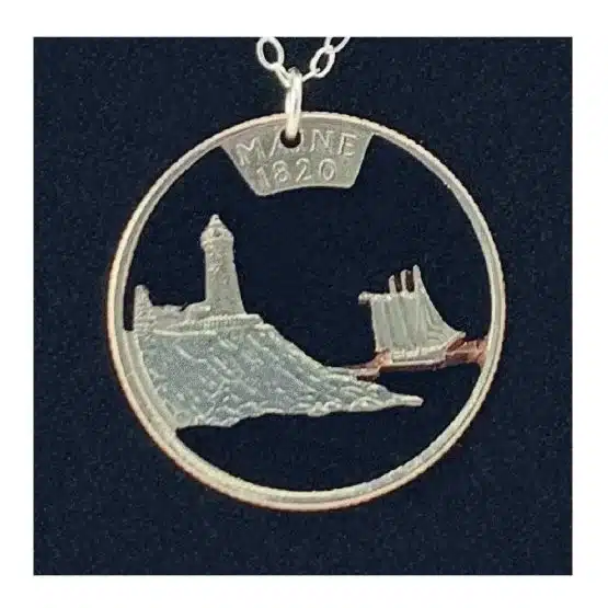In conclusion, the Maine State Necklace is made of an authentic State Quarter and holds historical significance. It’s also the third quarter of 2003 and the 23rd in the 50 State Quarters Program. Generally, symbolizing Maine’s admission into the Union as part of the Missouri Compromise on March 15, 1820. Furthermore, it’s captivating design features a rendition of the Pemaquid Point Light and a schooner at sea.