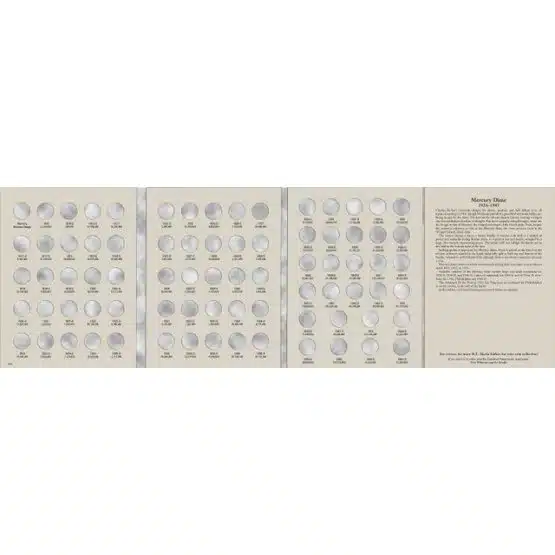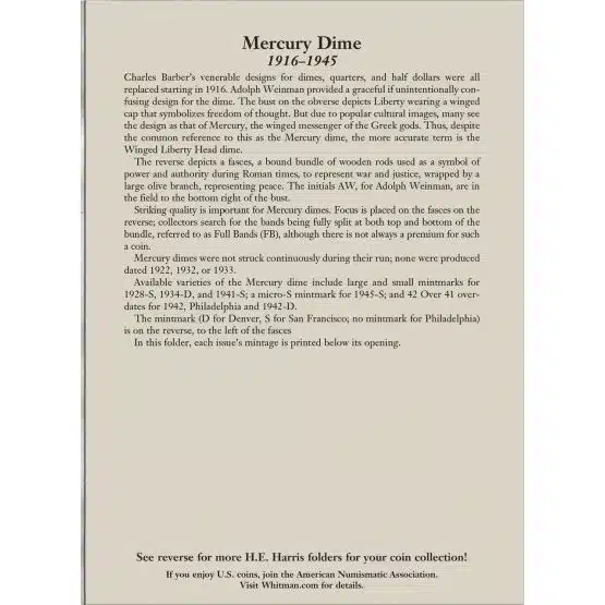 - Historical details: Inside flap includes history on the Mercury Dime and also mintage data below each opening.