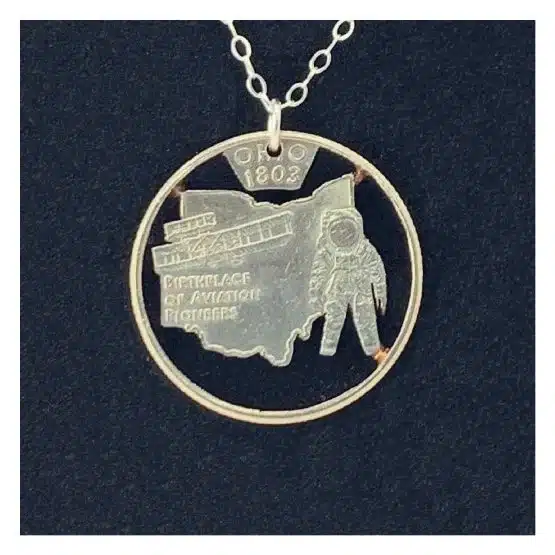 The inscription “Birthplace of Aviation Pioneers” highlights the state’s rich history, as notable figures such as Orville Wright, John Glenn, and Neil Armstrong were all born in Ohio. Lastly, the year 1803, marked on the coin, signifies Ohio’s admission to the United States, and this is proudly displayed through the Ohio state necklace.