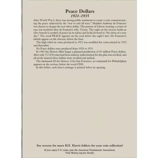 Introducing the HE Harris Peace Dollar folder, undeniably a must-have for any coin collector. Generally, for those looking to organize and display their collection of Peace Dollars minted from 1921 to 1935. This tri-fold folder opens flat for easy viewing and features a total of 27 openings (with 2 blanks) designed specifically for circulation-strike coins from the Philadelphia and Denver mints.