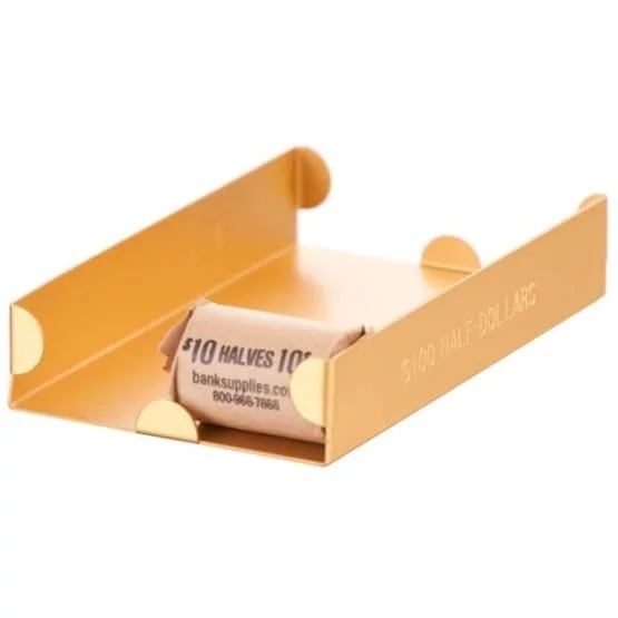Quarter Storage Tray: Elevate your coin storage capabilities with our gold/orange quarter storage tray, engineered from robust powder-coated steel. Measuring 3-1/8W x 1H x 9-7/8L offers a spacious layout for accommodating high volumes of quarter coins.