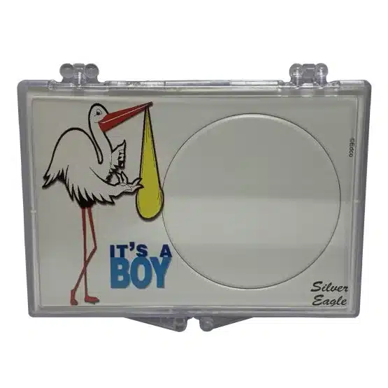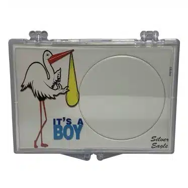 Introducing the It’s a Boy Stork snap lock 2×3 Coin Holder, designed specifically for the Silver American Eagle series. Further, Edgar Marcus designed this product from premium, crystal-clear polystyrene that ensures maximum visibility of your American Silver Eagle coins. Each display holder protects the coin and also showcases unique and beautiful artwork, making it an excellent addition for collectors.