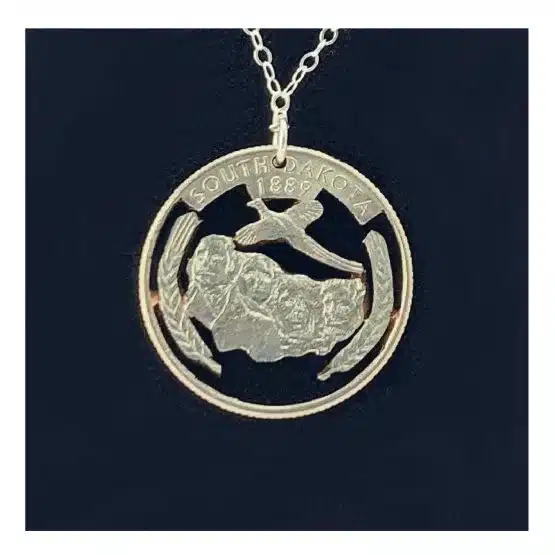- Unique Design: Each necklace is crafted from an authentic quarter and the words South Dakota, and 1889. The reverse also depicts imagery of a pheasant, above Mount Rushmore National Monument. Lastly it showcases the faces of four American Presidents and two heads of wheat to represent agriculture.