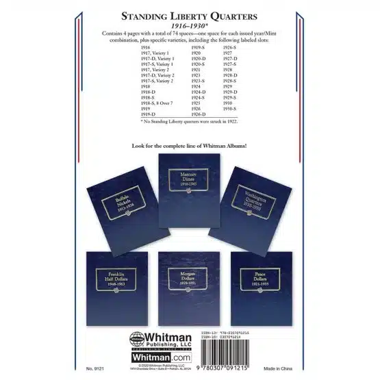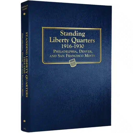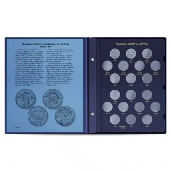 The Standing Liberty Quarter Album, designed for coin collectors and buffs, beautifully showcases the coins minted from 1916 to 1930. Moreover, this attractive Whitman coin album features vibrant color images and an informative page, thus providing a delightful introduction to the history and significance of the Standing Liberty Quarter series.