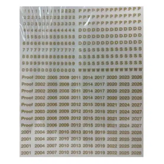 Enhance your Whitman Coin Album with these elegant gold letter sticker transfer sheets. The set includes dates from 1999 to 2028, allowing you to organize your coin collection with style and precision. Easy to use, rub and peel dates. Grab yours today!