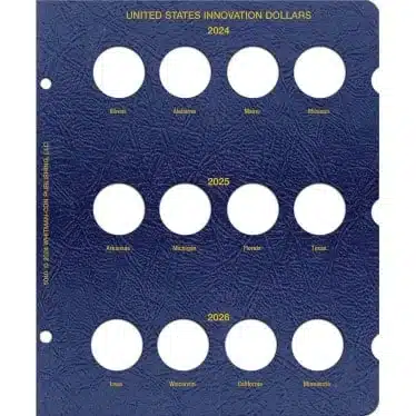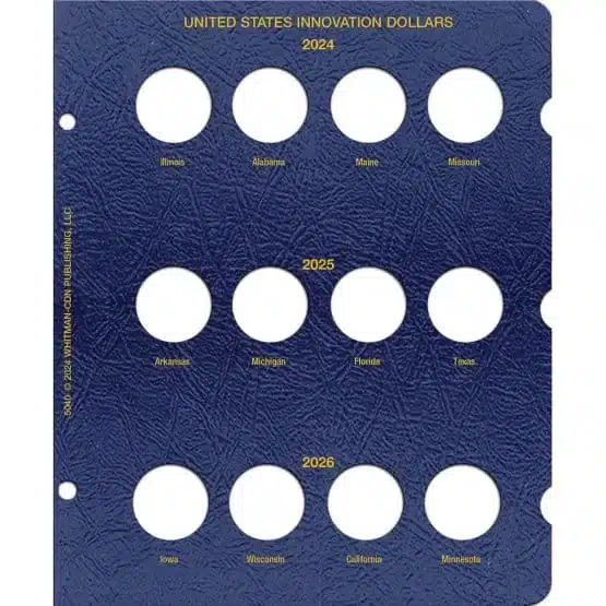 United States Innovation Dollar Single Mint Page 2024-2026. Updated page for United States Innovation Dollars Single Mint Album (0794847110) or fits the Universal Binder. Grained Leatherette Texture.