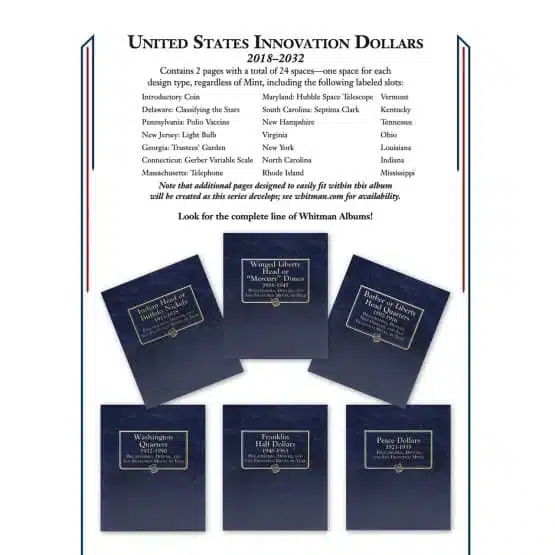 The United States Innovation Dollars Album, crafted by Whitman, stands out as an addition to any coin collector’s library. Moreover, this album is part of the classic series of coin albums. Additionally, it’s designed to house the innovative American Innovation $1 Coins.