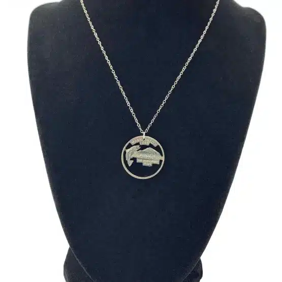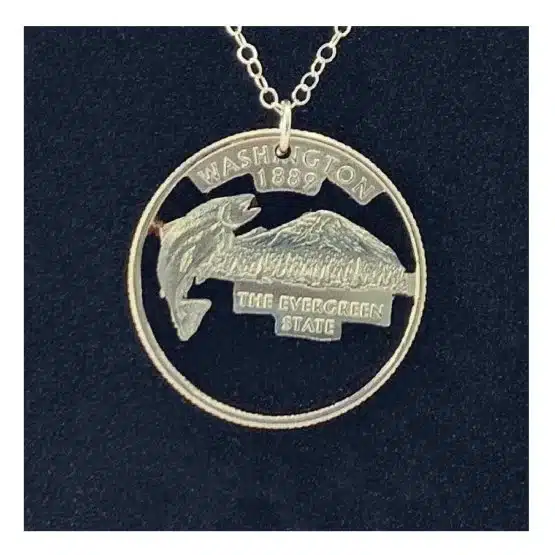 - Unique Design: Each necklace is crafted from an authentic Washington quarter with the words “Evergreen State”, Washington, and 1889 . It also features details highlighting a king salmon breaching the water in front of the majestic Mount Rainier.