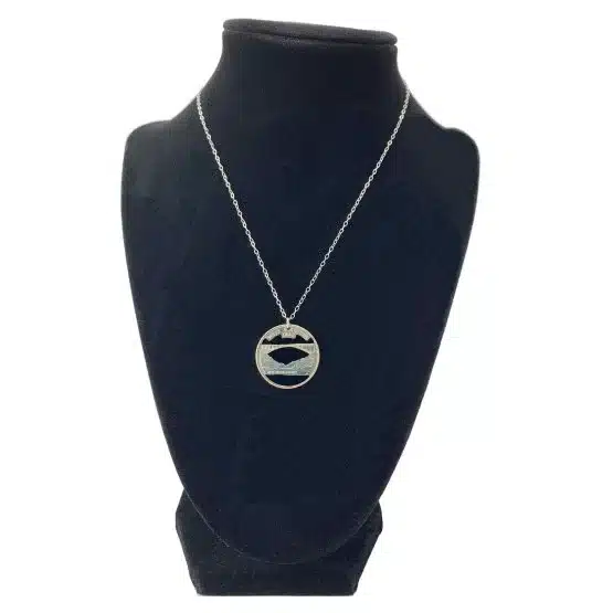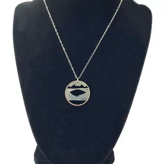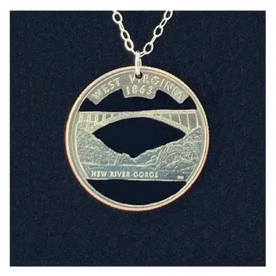 Furthermore, crafted from the fifth and final quarter-dollar coin released in 2005. It is also the 35th coin issued. This necklace furthermore captures the essence of West Virginia’s rich history. In addition, the reverse side of the quarter captures the scenic beauty of the State. It features a depiction of the New River and the New River Gorge Bridge. The coin bears the inscription “New River Gorge.