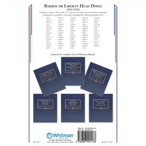Moreover, its organized layout facilitates easy viewing and preservation, which makes it a valuable addition to any collection. Ultimately, the album enriches understanding of the Barber Dime series and its role in American currency history. So, order your Whitman Barber Dime Album and start organizing and displaying your collection today!