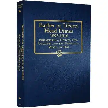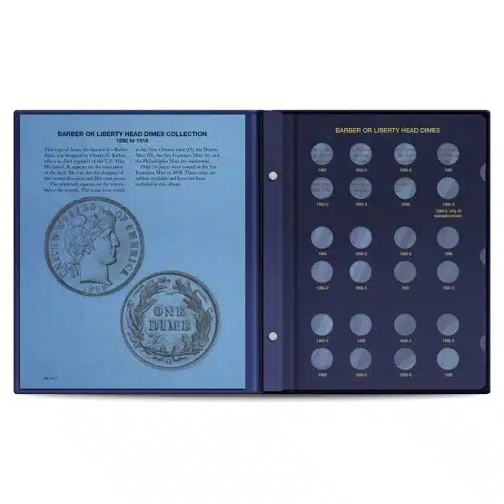 In conclusion, the Whitman Barber Dime Album 1892-1916 for Liberty Heads is more than a coin storage solution. In fact, it offers insight into American coinage history. Furthermore, this album represents a significant era in numismatics, thereby providing collectors with a connection to the past. Additionally, each page showcases the dimes while educating users on the Liberty Head design’s historical significance.