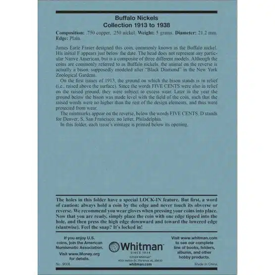 In conclusion, the Whitman Buffalo Nickel Folder, 1913-1938, stands out as an indispensable tool for coin enthusiasts. Its thoughtful design, durable materials, and informative content not only safeguard valuable coins but also enrich the collecting experience. Whether you are a beginner or an expert? This folder enhances organization, display, and knowledge, generally making it a must-have for anyone passionate about coin collecting.