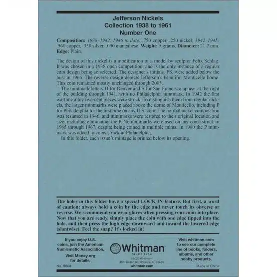 Therefore, don’t miss out! Grab your Whitman Folder No.1, Jefferson Nickel Collection 1938 to 1961 and safeguard your prized collection while showcasing it beautifully. So, order today and elevate your collection to the next level!