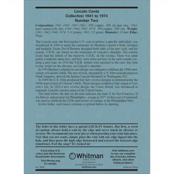 Introducing the Whitman Lincoln Cents Folder, No.2, years 1941-1974, is an essential tool for both novice and experienced coin collectors. This coin folder remains specifically designed for circulation-strike coins from the Philadelphia, Denver, and San Francisco mints. It also accommodates a total of 90 openings spread across three pages, perfect for organizing your Lincoln cent collection.