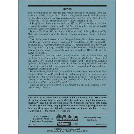 In conclusion, the Whitman Dime Coin Folders, no dates, remain an excellent entry point for both novice and seasoned collectors. This will generally provide a stylish and practical way to begin or enhance your collection. Moreover, embrace the world of coin collecting with Whitman’s extensive offerings and let your passion for history and artistry flourish.