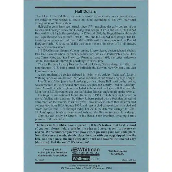 Therefore, start your coin collecting adventure now! Don’t miss out on the chance to purchase the Whitman plain Half Dollar Coin Folder with no dates and also elevate your collection. So, act fast—your journey with the Half Dollar begins today!