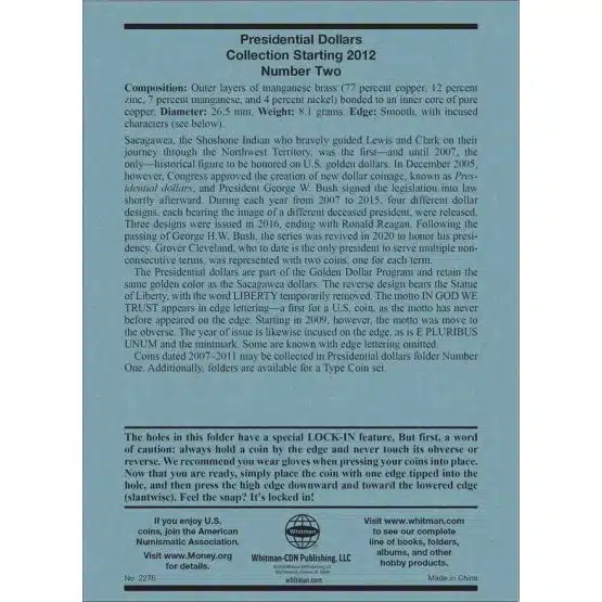 Enhance your coin collection by utilizing the Whitman Presidential Dollar Coin Folder #2! This exceptional folder is specifically designed for collectors and has the capacity to securely hold up to 48 coins that were minted between the years 2012 and 2016. Don’t miss out on this opportunity—order yours today!