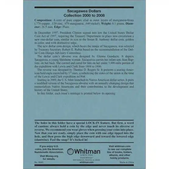 In conclusion, with its classic blue vinyl cover and thoughtful design, the Whitman Sacagawea Dollar Folder is an ideal choice for anyone looking to begin or expand their coin collection. Furthermore, explore the entire collection today and start your journey in coin collecting with confidence.