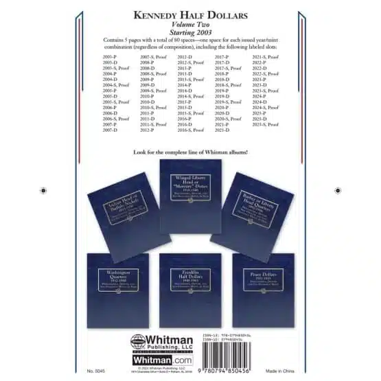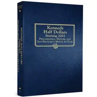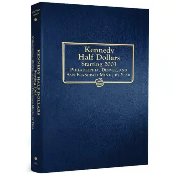 The Whitman Kennedy Half Dollar album is an essential companion for coin collectors. Furthermore, offering a reliable and attractive way to display Kennedy Half Dollars starting from 2003 and continuing through 2025. Above all, this Whitman coin album is expertly crafted to protect valuable coins while providing easy access for viewing and handling.