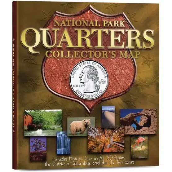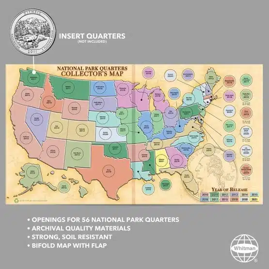 Therefore, explore the entire collection today with the Whitman National Park Quarters Map, your journey across America awaits. Lastly, the collector’s map has expanded dimensions of 13×16.5 inches when fully extended and provides ample space for displaying your cherished coins.
